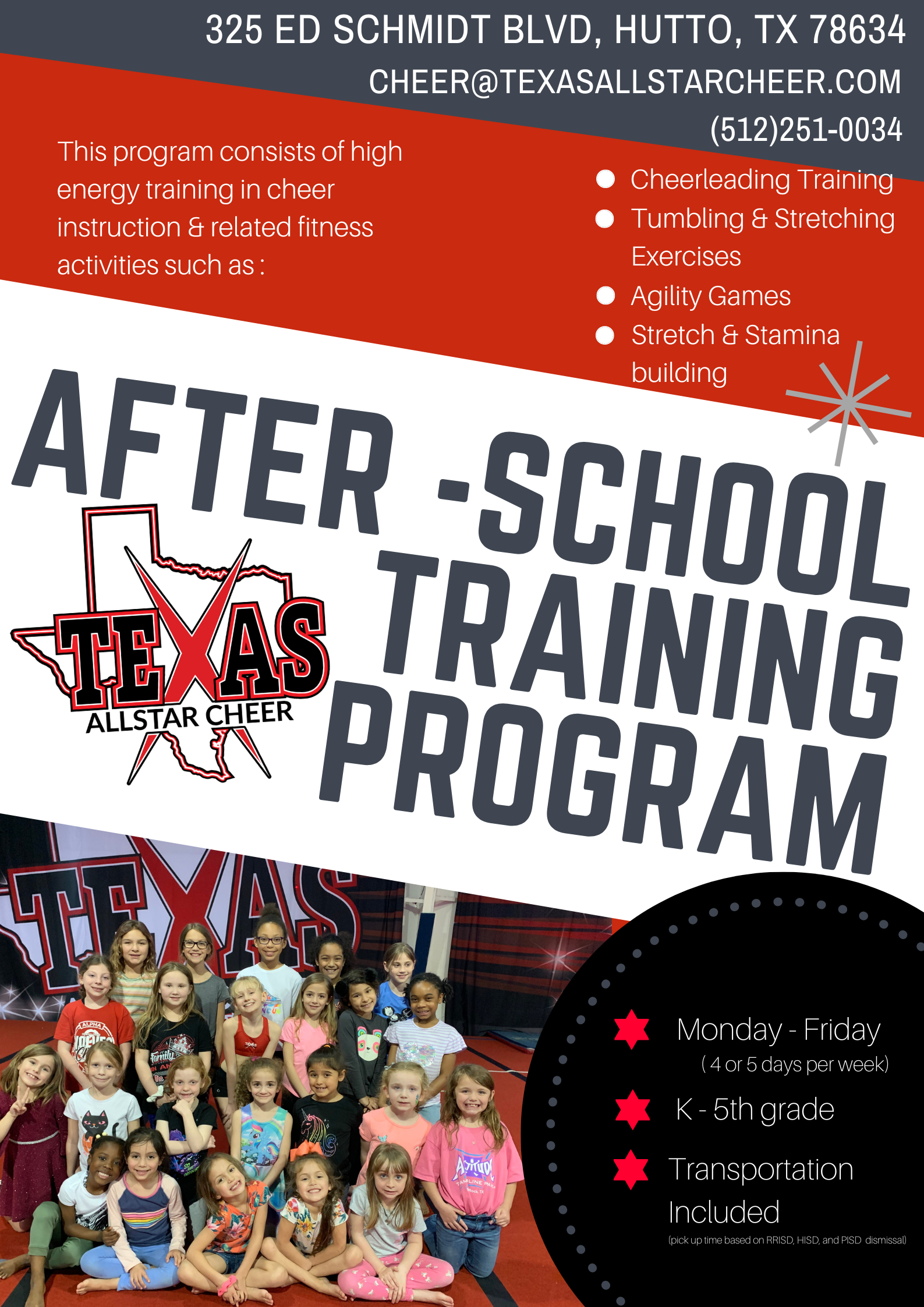 Looking for an after-school training program for your student? We are now accepting enrollments for our Allstar After School Training Program here at TAC. We offer 4 and 5 days/week pick up options at $300 and $325/month, respectively. Alternatively, schools not listed in the program below may opt for non transport and drop off at our location.