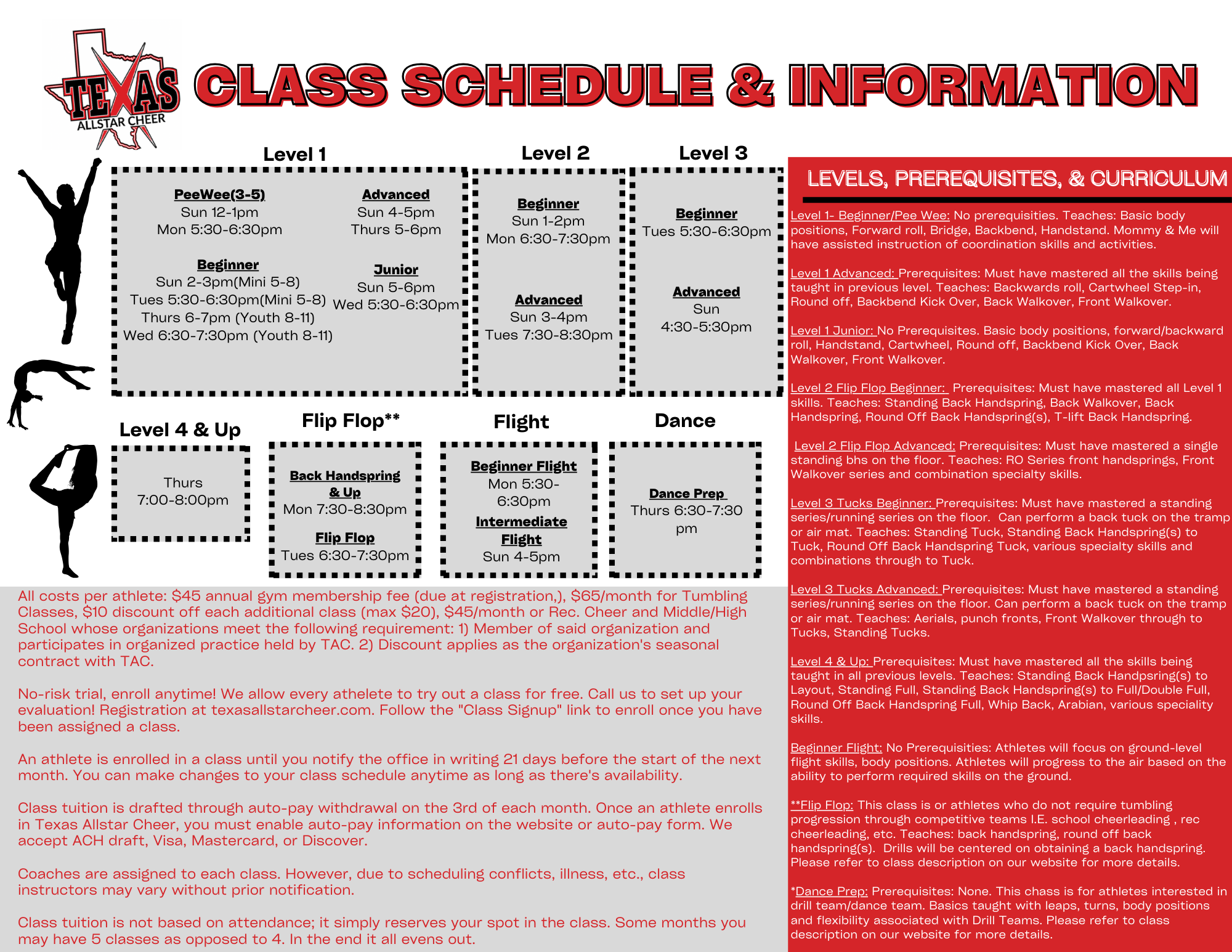 Classes are run by our experienced and qualified coaches, and we offer different levels to cater to all athletes from absolute beginners to elite tumblers. They offer an excellent opportunity for affordable, additional training for Rec, School, or All-Star cheerleaders and those from other sports/activities (e.g dance) who wish to improve their tumbling skills in a safe and supervised environment. Please read carefully as we have multiple levels and dance classes included.